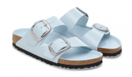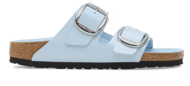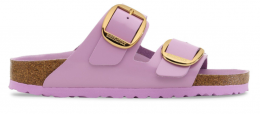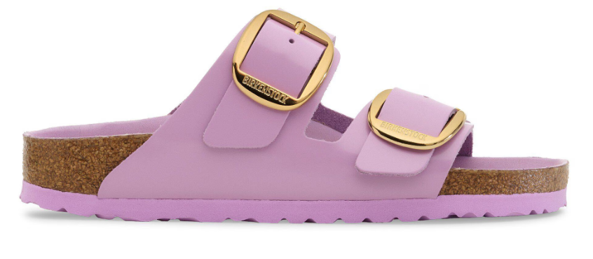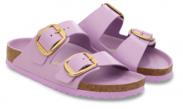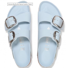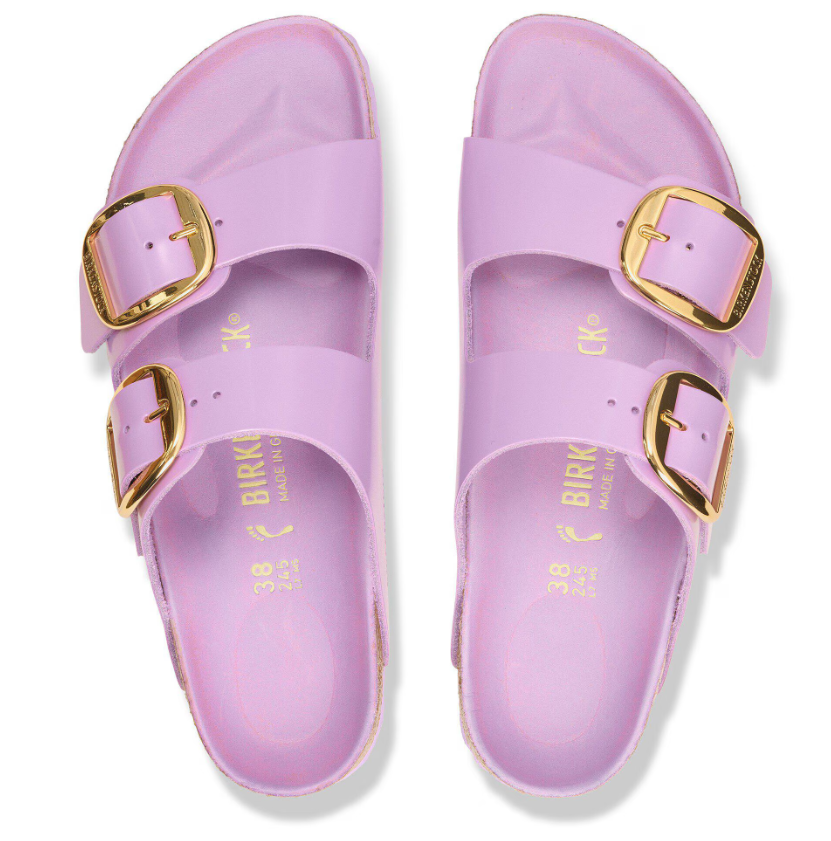 The BIRKENSTOCK Arizona Big Buckle Patent Leather sandal is a modern twist on the classic two-strap design, featuring amplified buckles and a high-shine finish. This version combines elegance with comfort, making it a standout choice for those seeking both style and support.