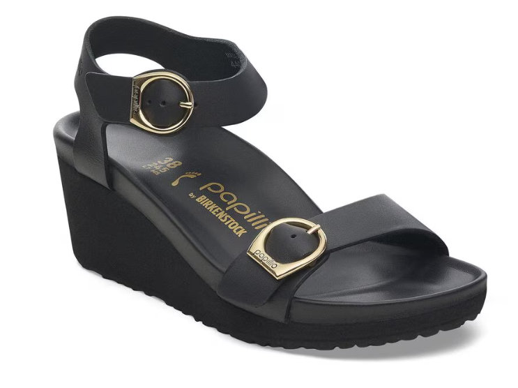 The Birkenstock Soley Ring-Buckle sandal from the Papillio collection combines elegant design with renowned Birkenstock comfort. Featuring a stylish wedge heel and refined ring buckle details, this sandal is crafted for both fashion and function.